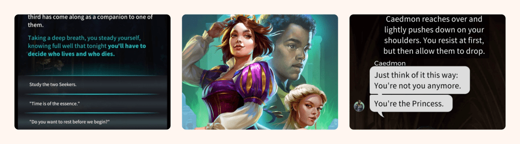 I wrote and designed two choose-your-own-adventure stories for this app. The first one, Mirror Mirror, featured an isekai and a case of mistaken identity. Mirror, Mirror blended humor, mystery, and magic with a dash of Irish and medieval folklore. The second story, The Grove, was a morally complex tale about family obligation and what happens when you’re given the power to grant life and immortality… but only to a select few.